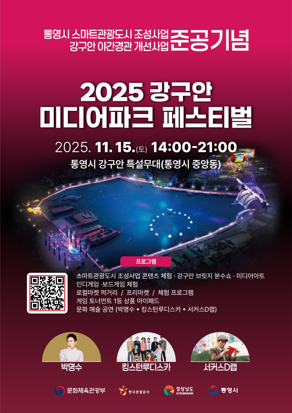 통영 스마트관광도시 조성사업, 강구안 야간경관 개선사업 준공기념으로 진행되는 2025 강구안 미디어파크 페스티벌은 다양한 게임 부스와 먹거리존을 즐길 수 있다.